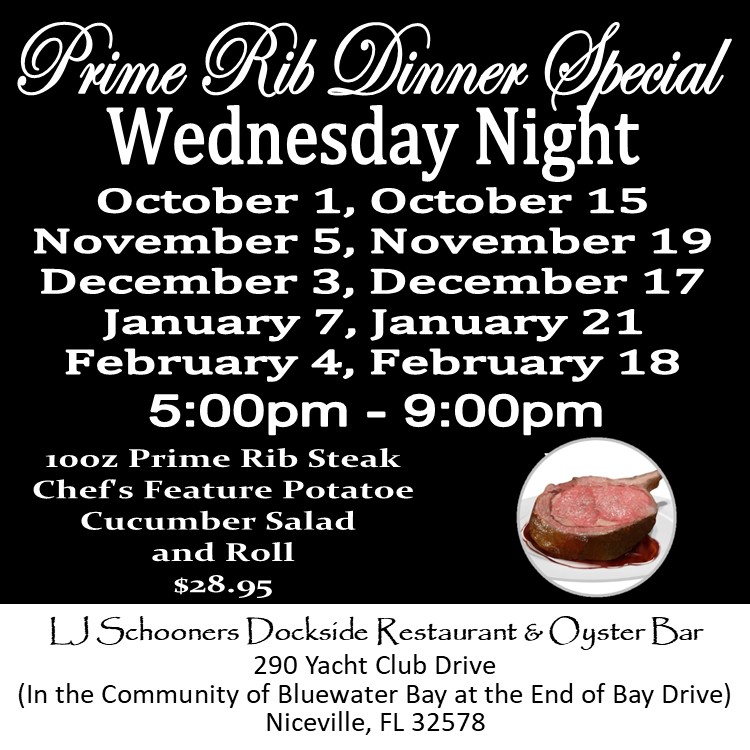 Saturdays, 5pm – 9pm Join us for STEAK NIGHT SATURDAYS at LJ Schooners Dockside Restaurant & Oyster Bar. Chef will have his best steaks!!!Every Saturday,