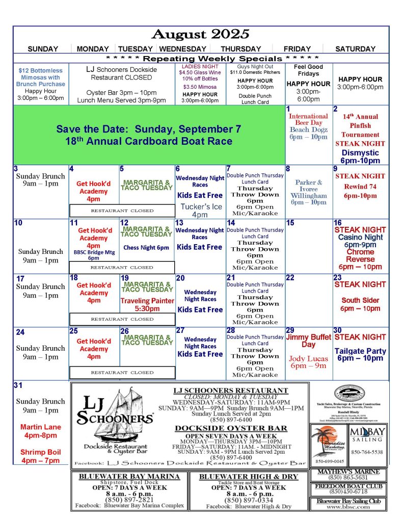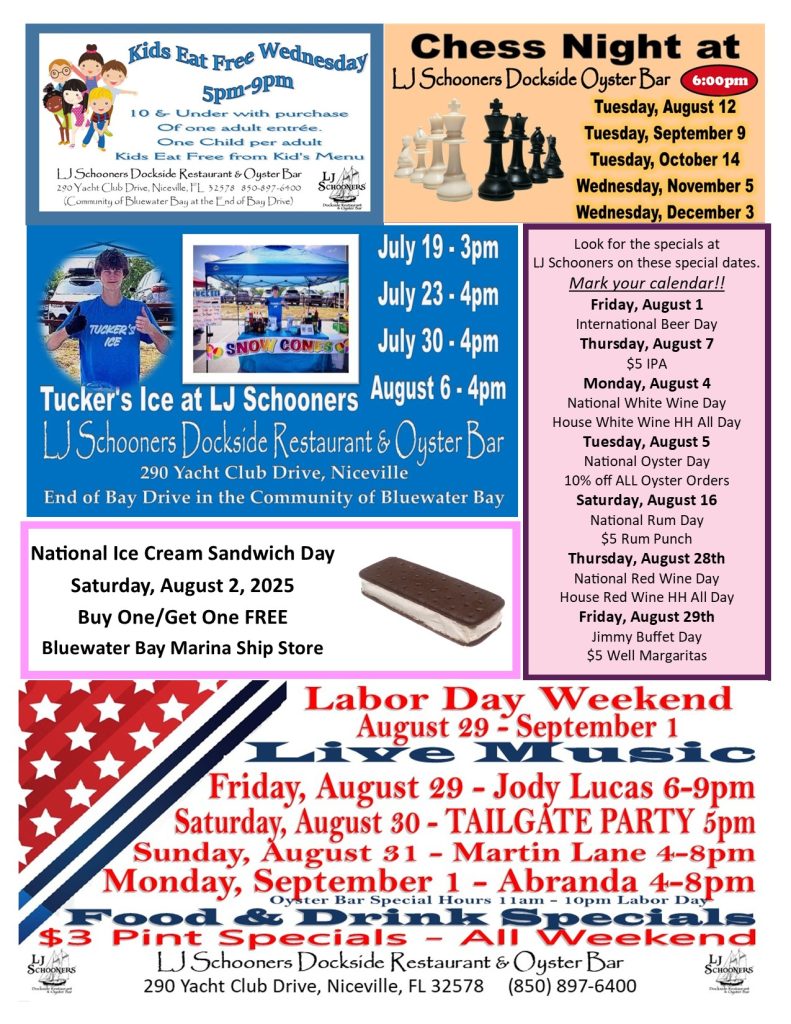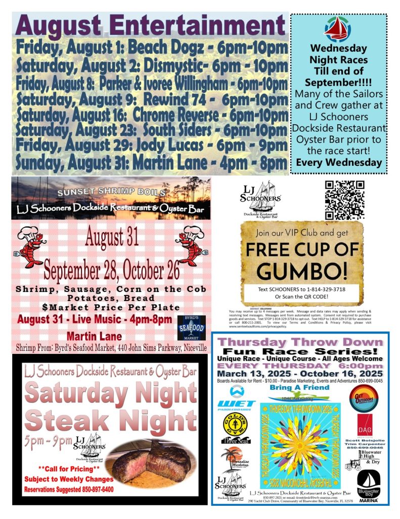 Saturdays, 5pm – 9pm Join us for STEAK NIGHT SATURDAYS at LJ Schooners Dockside Restaurant & Oyster Bar. Chef will have his best steaks!!!Every Saturday,
