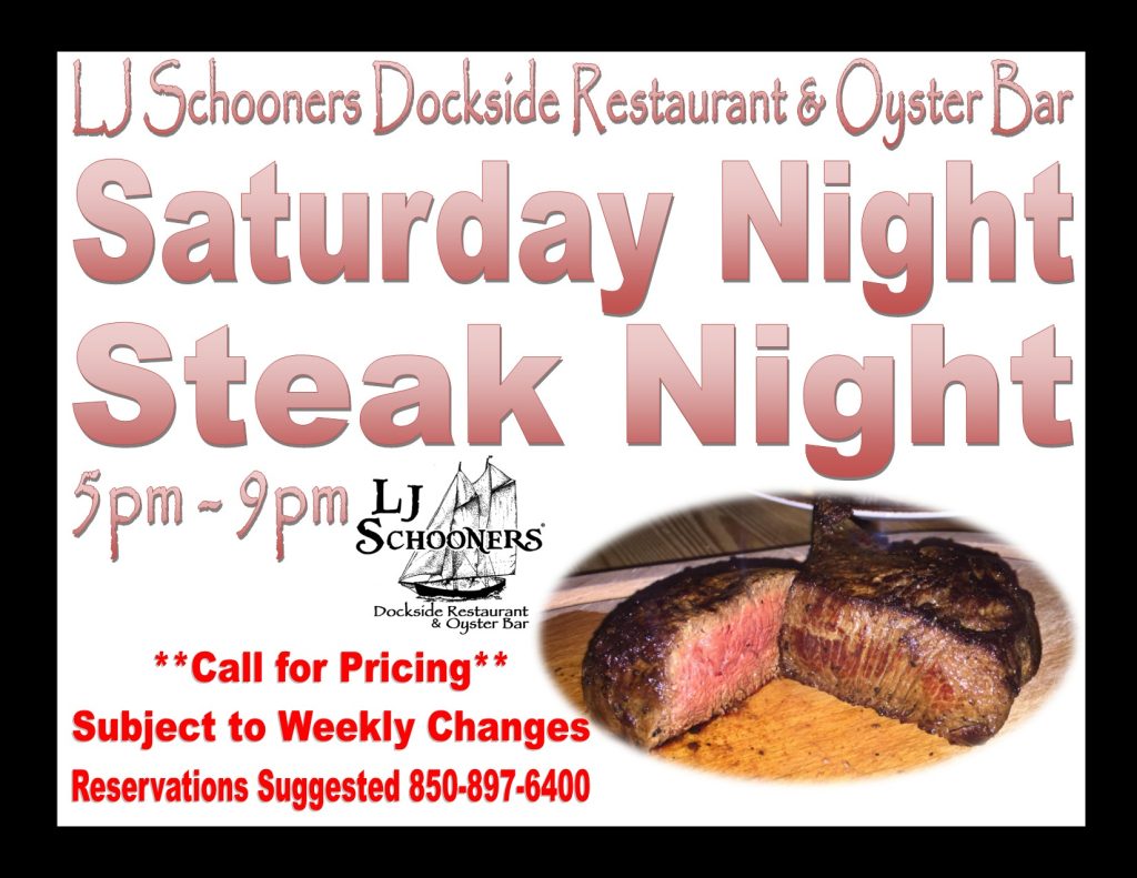 Saturdays, 5pm – 9pm Join us for STEAK NIGHT SATURDAYS at LJ Schooners Dockside Restaurant & Oyster Bar. Chef will have his best steaks!!!Every Saturday,