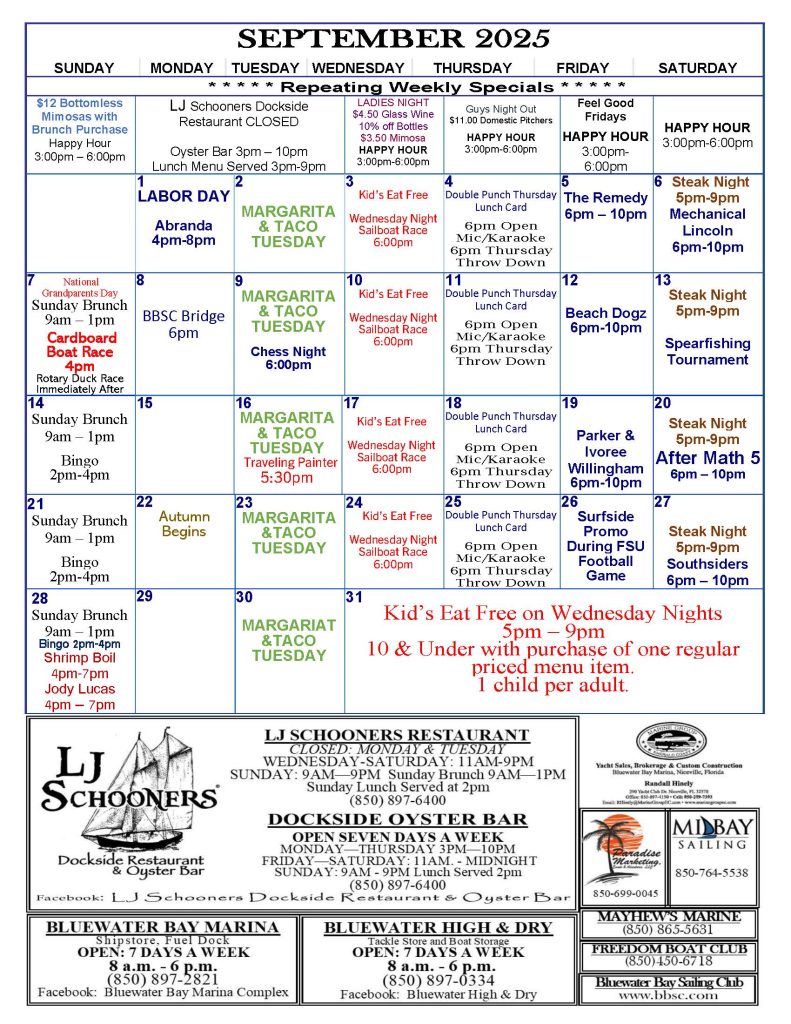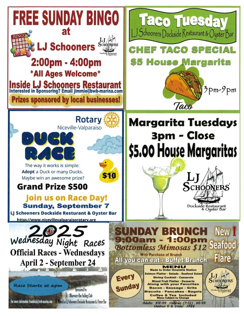 When: Sundays Time: 2pm – 4pm New to LJ Schooners – Sunday Bingo!!!! Sunday’s at 2pm – 4pm.Inside LJ Schooners Restaurant, All Ages Welcome! Open