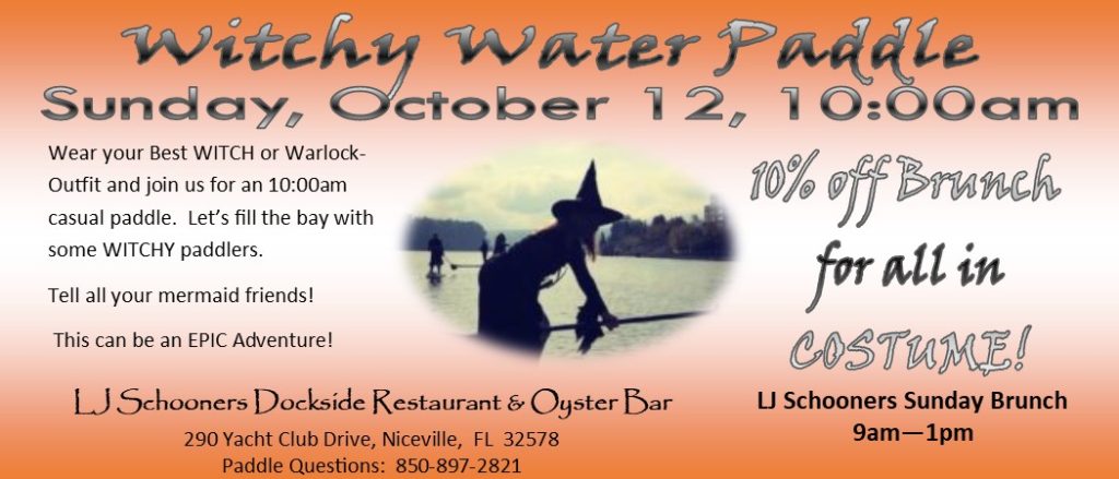Silly fun Sunday, October 12, 2025 – our Annual Witch Water Paddle, 10am. Find your best Witch or Warlock costume and let’s hit the water at 10AM – paddling to Rocky Bayou Bridge (weather permitting) and if you are training for a long race – go further!!! Photo on beach at 10AM and the water fun!!!! Grab a friend and load the boards! #witchywaterpaddle #thursdaythrowdown #supfun