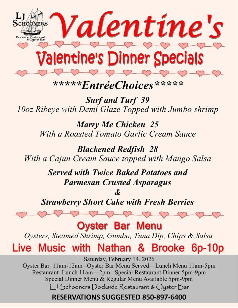 When: Saturday, February 14, 2026 Time: 5pm – 9pm Chef has a special menu for Valentines Dinner and also our regular menu!Surf and TurfMarry Me
